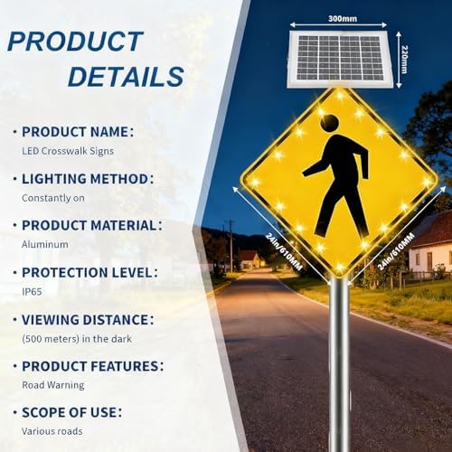 Enhance safety and visibility at pedestrian crossings with our Solar-Powered LED Flashing Pedestrian Crossing Sign. Designed to address the challenges of low visibility during heavy rain and busy school zones, this sign is an essential addition for any roadway or crossing area. Imagine a scenario where pedestrians, especially children, can cross the street with confidence, and drivers are alerted from 100 meters away. Our sign utilizes advanced solar technology to ensure it remains visible even in the darkest conditions, boasting an impressive visibility distance of 2000 meters. Crafted from durable aluminum with a reflective film and high-quality LED beads, this sign is built to withstand harsh weather conditions, with an operating temperature range of -40℉ to 140℉. Its IP65 protection rating ensures it can handle rain and moisture, making it an ideal choice for outdoor use. Installation is simple and can be customized to your needs with options for sizes of 24x24 inches or 30x30 inches. The solar panel, rated at 18V 10W, offers flexible installation, ensuring it captures maximum sunlight throughout the day. The sign features two lighting modes—constant and flashing—allowing you to choose the best visibility option for your location. Our product is designed for longevity, with a lifespan of 5-7 years, ensuring you get great value. It also comes with a comprehensive package that includes a solar parking sign, solar panel, and mounting accessories. For optimal performance, ensure the LED light functions correctly before installation, and adjust the solar panel for maximum sunlight exposure. If you have any concerns before or after your purchase, our dedicated support team is ready to assist you within 12 hours. Invest in safety and peace of mind with our Solar-Powered LED Flashing Pedestrian Crossing Sign—because every crossing matters.