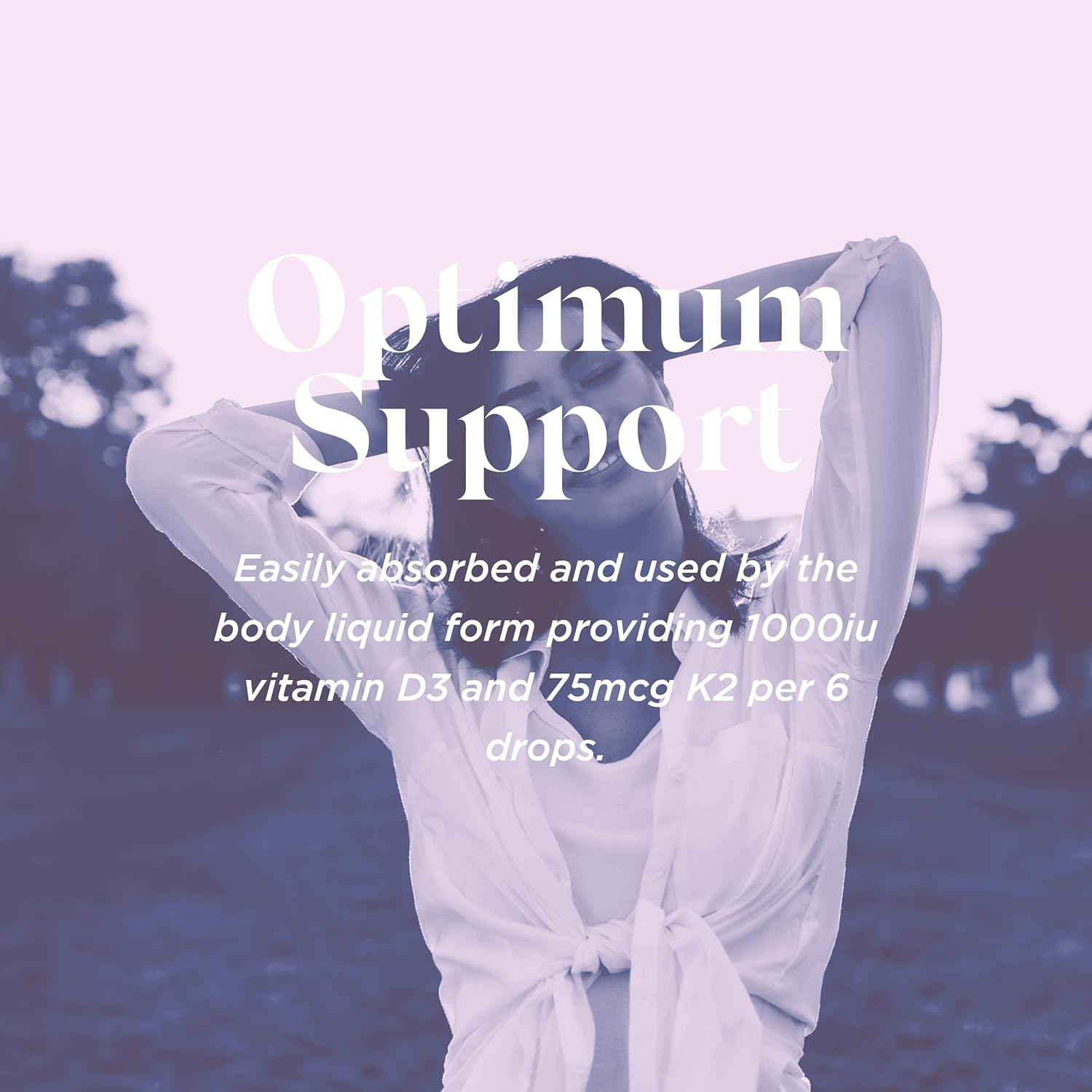 Liquid vegan vitamin D3 and K2 for bone and immune support Clinically effective - vitamin D3 supports calcium absorption and immunity with vitamin K2, to support healthy bone formation Optimum support - optimally absorbed, high potency liquid form with 1000iu vitamin D3 and 75mcg K2