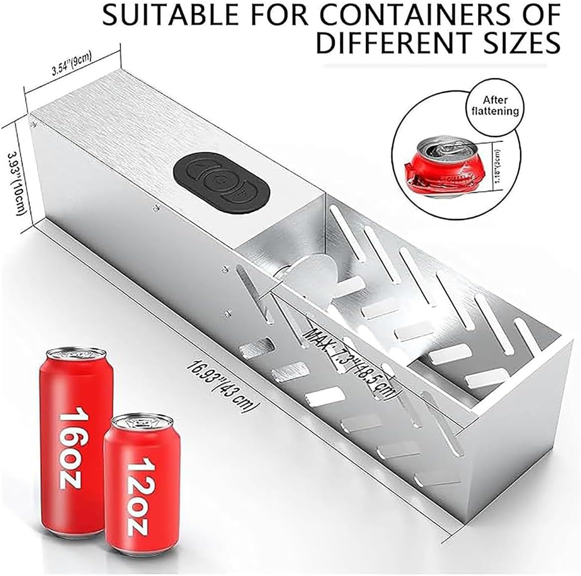 Electric Can and Bottle Crusher – Effortless Recycling for Home & BusinessPowerful & Efficient CrushingThis stainless steel electric can crusher effortlessly compresses aluminum cans (200ml-500ml) and plastic bottles (200ml-330ml), reducing waste volume by up to 80%. Perfect for beer cans, soda cans, and beverage bottles, it eliminates the need for manual stomping or bulky air compressors.Smart One-Touch Control"Forward" button: Crush single cans/bottles with a simple press."Reverse" button: Safely release jammed materials."Auto-cycle" button: Continuous crushing—just load and let the machine work!Space-Saving & Versatile InstallationFreestanding or wall-mounted (hardware included).Compact size (435×90×100mm) fits tight spaces like kitchens, garages, or bars.Universal Voltage & Durable BuildStainless steel construction resists rust and lasts for years.Package Includes1× Electric can crusherMounting screwsInstruction manualShips in protective packaging (450×110×100mm)Ideal for: Home recycling, bars, restaurants, and eco-conscious businesses.Why Choose This Crusher?✓ No manual effort – Fully automatic operation✓ Quieter than pneumatic crushers✓ Easy to clean – Smooth stainless steel surface