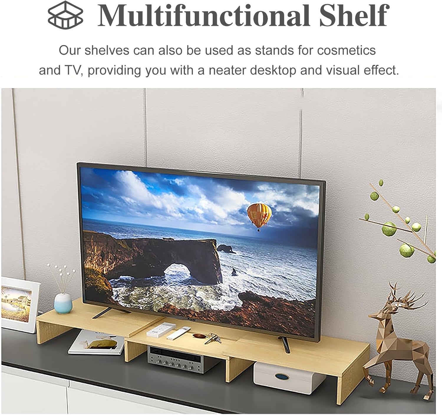 Computer Screens Organizer Storage Rack:Are you tired of experiencing discomfort while working long hours at your desk? Our monitor stand is designed to elevate your computer screen and promote a healthier, more ergonomic workspace. By raising your monitor to eye level, you can reduce neck and back strain, allowing for a more comfortable work experience. **Product Highlights:** - **Sturdy Construction:** Made from high-quality Medium Density Fiberboard (MDF), this monitor stand is built to last, providing stability and support for your devices. - **Space-Saving Design:** Perfect for small desks or corner workspaces, it helps declutter your area while enhancing organization. - **Versatile Style Options:** Available in White, Dark Wood, Natural, and Black, this stand complements any home or office décor. - **Easy Installation:** Set it up in minutes without any hassle, so you can focus more on your tasks and less on assembly. - **Ergonomic Benefits:** Designed to promote good posture, it helps alleviate fatigue, enabling you to work longer with greater comfort. **Specifications:** - **Dimensions:** Available in widths of 200mm (7 7/8") and 240mm (9 1/2"). Please refer to the images for additional dimensions. **Usage Tips:** - The monitor stand is an ideal solution for anyone working from home or in a traditional office setup, enhancing both productivity and well-being. - Note that color variations may occur due to different display settings, and measurements may vary slightly due to manual handling. Upgrade your workspace today with our monitor stand and experience the difference in comfort and efficiency!