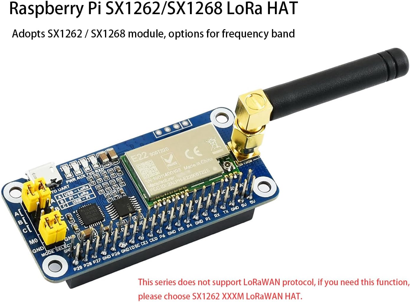 SX1262 LoRa HAT for Raspberry Pi, 915MHz Frequency Band, for America, Oceania, Asia Features Standard Raspberry Pi 40PIN GPIO extension header, supports Raspberry Pi series boards Onboard CP2102 USB TO UART converter, for serial debugging Brings the UART control interface, for connecting host boards like Arduino/STM32 4x LED indicators, easy to check the module status LoRa spread spectrum modulation technology, up to 81 available signal channel, longer communication distance, more robust to interference Auto multi-level repeating, suit for ultra long range communication, allows multi network on the same region Low power consumption features like deep sleeping and Wake on Radio, ideal for battery-powered applications Customizable communication key which won't be retrieved, greatly improves the security of user data Supports LBT, monitoring the signal channel noise before transmitting, greatly improves the success ratio under extreme environment Supports RSSI signal intensity indicating, for evaluating signal quality, tuning the network Supports wireless parameter configuration, by sending wireless command/data packet, remotely configure or retrieve the module parameter Supports fixed-point transmission, broadcast, signal channel monitor Comes with development resources and manual (examples for Raspberry Pi/STM32) Specification Radio rate: 0.3kbps ~ 62.5kbps (programmable) Transmit power: 22.0dBm (10/13/17/22dBm programmable) Receive sensitivity: -147dBm (radio rate 2.4kbps) Communication interface : UART (TTL level) Baudrate: 1200bps ~ 115200bps (9600bps by default) Packet length : 240 Byte (32/64/128/240 Byte programmable) Cache: 1000 Byte Package Content 1.SX1262 915M LoRa HAT x1 2.USB type A plug to micro plug cable x1 3.915MHz antenna x1 Online Development Resources: //bit.ly/49bRpSJ