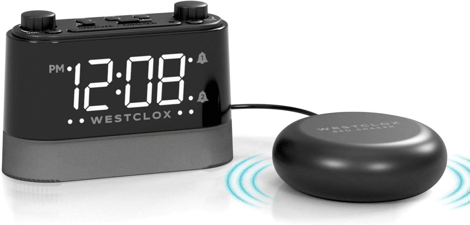Discover the ultimate wake-up solution with the Westclox Vibrating Bed Shaker Alarm Clock, expertly designed for both men and women. This state-of-the-art alarm clock features an array of advanced functionalities to enhance your morning routine. Experience a customizable wake-up with our adjustable vibration intensity, which allows you to choose between vibration, audible alarms, or both. Whether you need a gentle nudge or a robust shake, this clock meets your needs with precision. The rotary knob adjustable alarm volume ranges from a subtle 60db to an impressive super loud 113db, ensuring that you wake up effectively, no matter how deeply you sleep. The dual alarm feature is perfect for managing multiple wake-up times, while the large snooze button and adjustable snooze duration (1-30 minutes) offer flexibility for those extra minutes of rest. Set your alarms to suit your schedule with the adjustable alarm duration (1-59 minutes) for a personalized wake-up experience. Enhance your room's ambiance with the forward-facing flashing alarm lights and the night light with an adjustable dimmer. The 1" large display is easy to read and features adjustable brightness for optimal visibility at any time of day. The clock also includes a USB charging port to conveniently charge your smartphone, tablets, speakers, and other devices. Operated by electricity (100V-240V adapter included), this clock can also be used with batteries (2 AAA batteries not included) as a backup for uninterrupted operation during power outages. Embrace a modern design with the Westclox Vibrating Bed Shaker Alarm Clock and start each day with precision and style.
